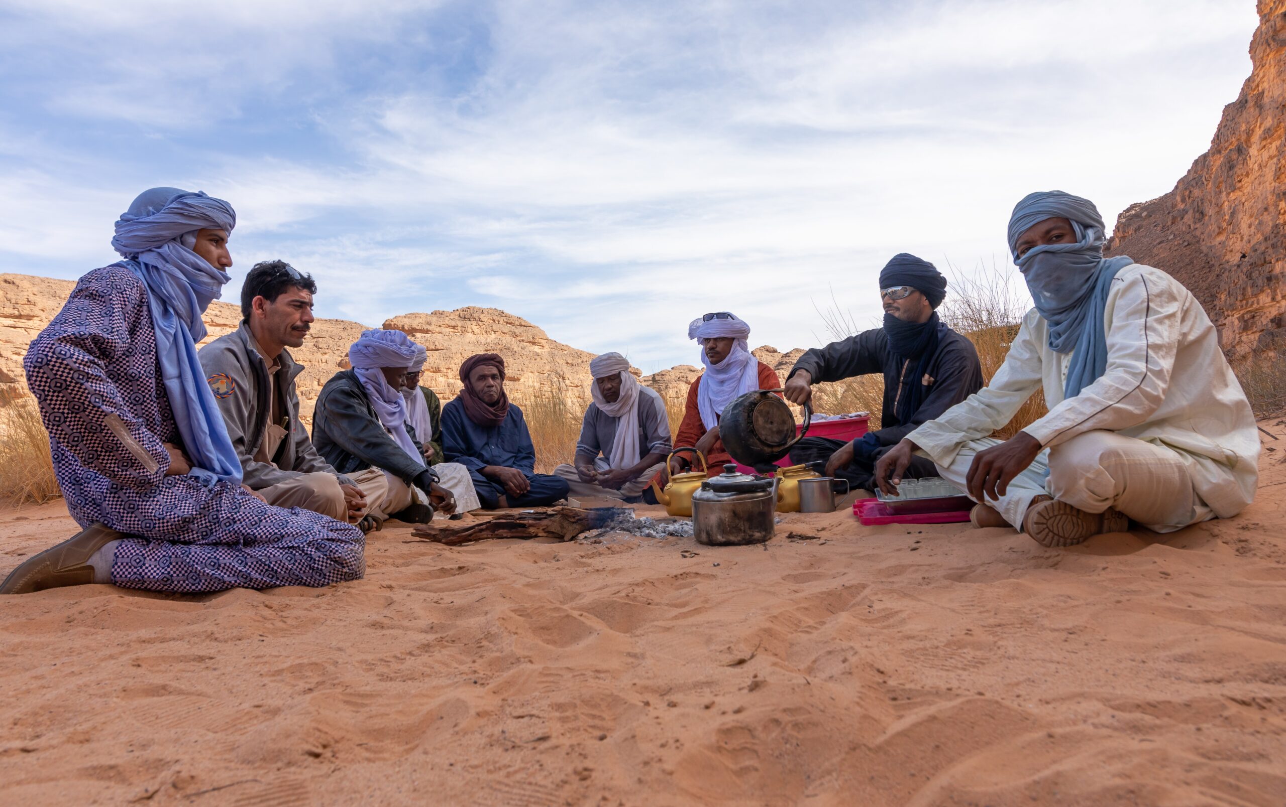 Es difícil explicar lo que se siente al estar en mitad del desierto del Sáhara, tras una jornada de ruta entre dunas infinitas, comiendo simple pero sabroso, sintiendo el sol y el silencio. Ahora, con la cena ya pasada, nos sentamos en círculo junto a la hoguera. El té humea en nuestras manos, y sobre nuestras cabezas, el cielo es una explosión de estrellas.